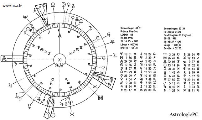 - Приближение МС гороскопа СД Чарльза к Сатурну гороскопа СД Дианы;