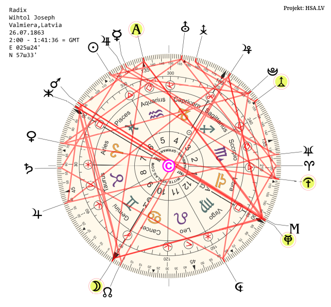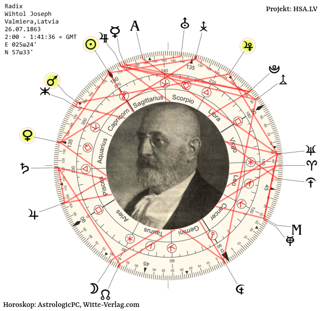 К равенствам и планетным картинам с такими личными точками как МС и AS следует относиться внимательно, т. к. вероятнее всего, время в метриках указано приблизительно. Однако и имеющееся время и равенство на оси МС уже говорят о том, что И.Витол будет обладать прочным, стабильным (Адмет) авторитетом (Крон), а в избранной профессии (МС=Крон), однако у него может быть много как тревог, так и различных событий, революционных перемен (Уран), тем не менее, сохраняя стабильность (Адмет) и качество (Крон) индивидуальности (МС) и т.д. Здесь можно указать и на постоянство и склонность к стабильности, например, выбрав свою профессию, Витол более 30 лет посвятил учебному заведению, которое сам окончил, а потом многие годы здесь же и преподавал. И если бы не революция (1917-1918 гг.), то, возможно, так и остался бы преподавать в Санкт-Петербургской консерватории.